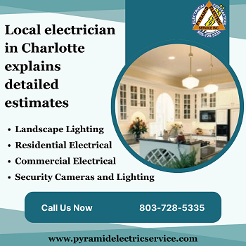 Local Electrician In Charlotte Nc Shares Clear Estimate ValueLocal electrician in Charlotte NC shows how detailed estimates reduce costs, prevent delays, and give you long-term peace of mind. Pyramid Electric Services is your local Charlotte electrician. We are an experienced professional electrical contracting company serving the Charlotte area, Marvin, Weddington, Mathews, Wesley Chapel, and Waxhaw. We are licensed and insured in North Carolina and South Carolina.