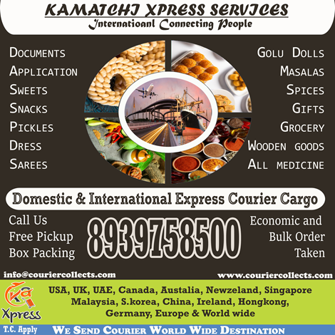 Chennai To Usa Courierkamatchi xpress Specializes in international courier service 8939758500 with door-to-door pickup and delivery. They cater to over 200 countries, including the USA, UK, Canada, and world wide services. We send courier on Documents, Food items, Sweets, Snacks, Masala, Pickels, Dresses, Gift itmes, Artifical material, wooden material, golu dolls, Industrial goods and etc.