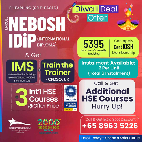 Diwali Offers: Nebosh Idip SingaporeTake your HSE career to the next level with our globally recognized NEBOSH IDIP Training in Singapore, the ultimate qualification in Occupational Health and Safety. Designed for ambitious safety professionals, this advanced NEBOSH training equips you with practical expertise to manage complex risks, ensure compliance with international standards, and lead safety initiatives across industries. As part of our exclusive offer, you also get IMS (Internal Auditor Training), Train the Trainer (UK-certified), and 3 International HSE Courses at a special price. With flexible instalment options, IOSH membership eligibility, and globally accepted certification, this program empowers you to achieve career growth and international recognition. Enroll today to shape a safer workplace and unlock limitless opportunities in the world of health and safety. Contact: +65 8963 5226 Visit us: https://greenwgroup.co.uk/singapore/nebosh/nebosh-idip/