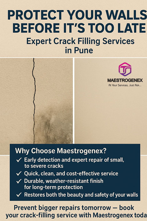 Filling Cracks Exterior Service In PuneProtect your home from water damage and structural issues with Maestrogenex’s Exterior Crack Filling Service in Pune. Our experts efficiently seal cracks on walls, facades, and exteriors, ensuring durability, weather resistance, and a smooth finish. Using high-quality materials and professional techniques, we restore the strength and appearance of your home’s exterior. Keep your home safe, strong, and beautiful with Maestrogenex!