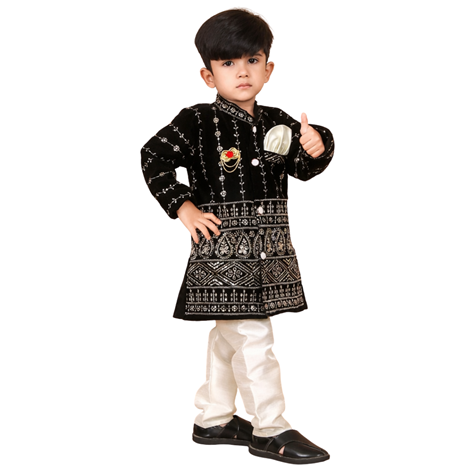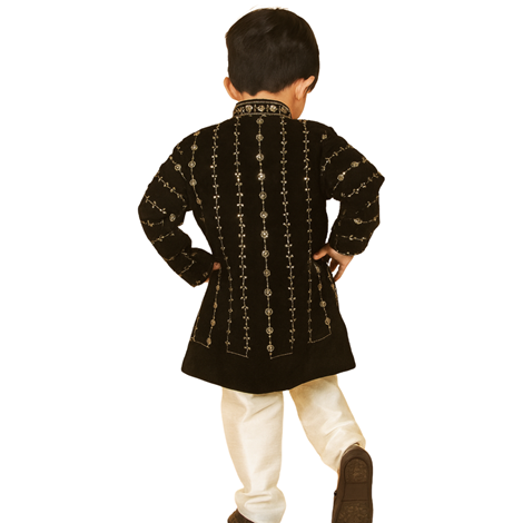 Buy Boys Black Velvet Sherwani Set For Kids, Kids Sherwani For BoysBoys Black Velvet Sherwani Set for Kids – Embroidered Sherwani with White Silk Pyjama, Mandarin Collar Achkan Style – Kids Sherwani Set for Boys
