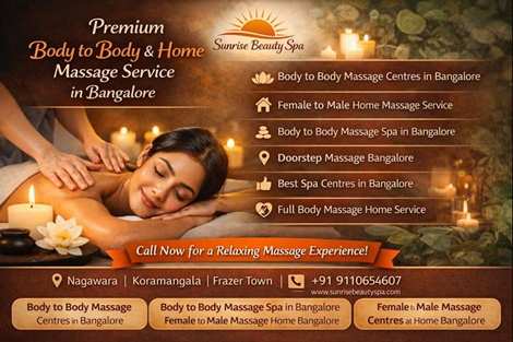 Body To Body Massage In BangaloreCall @ +91 911-065-4607, Experience professional body to body massage in bangalore at Sunrise Beauty Spa, where relaxation meets care and professionalism. Our spa is designed for individuals looking to release stress and restore balance in a safe, calm environment. Located in prime Bangalore neighborhoods, we follow strict hygiene standards and personalized service practices. Each session is tailored to individual comfort levels, ensuring a soothing and rejuvenating experience. Sunrise Beauty Spa Bangalore welcomes guests seeking dependable wellness services delivered with respect, discretion, and attention to detail in a peaceful spa setting.