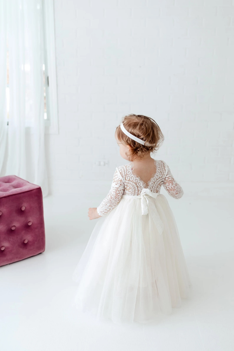 Ivory Bohemian Flower Girl Dress, White Lace Beach Wedding Dress For GirlsThis dress is simply beautiful! It features a delicate white lace bodice paired with a soft ivory tulle skirt for a dreamy, elegant look. The V-back with unfinished lace adds a lovely boho-chic touch, while detailed lace sleeves and a removable flower sash complete this charming special-occasion dress.