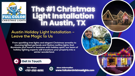 Full Color Christmas LightsFull Color Christmas Lights is a professional Christmas light installation services for both residential and commercial properties in Austin, TX. We provide custom designs, expert installation, and hassle-free take-down and storage solutions. We offers a range of installation services, including roofline and roof ridge lighting, pathway illumination, tree trunk & branch wrapping, cascading "whimsical" lights, festive wreath & garland placement, and even permanent lighting solutions. Address: 1044 Camino La Costa Ste 2102, Austin, TX 78752, United States Phone Number: +1 737-252-8261 Business Hours: Monday: 8:30am-6:00pm Tuesday: 8:30am-6:00pm Wednesday: 8:30am-6:00pm Thursday: 8:30am-6:00pm Friday: 8:30am-6:00pm Saturday: Closed Sunday: Closed Services: Lighting contractor Specialties: Roofline Lights, Pathway Lights, Roof Ridge Lights, Tree Lights, Tree Trunk & Branch Wraps, Cascading “whimsical” Lights, Wreaths & Garlands, Permanent Lights Payment Methods: Check, Credit Cards, Debit Cards, Visa, ATM / Debit, Mastercard, AMEX, Paypal, Discover Keywords: outdoor lighting Austin TX, landscape lighting Austin TX, outdoor lighting services, holiday lighting services, commercial exterior lighting, indoor lighting Austin TX, landscape lighting services, holiday lighting Austin TX, Tree Lights Austin TX, Roofline Lights