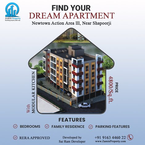 1Bhk Flat For Sale Near Shapoorji Newtown Kolkata1BHK Flat For Sale Near Shapoorji Newtown Kolkata An airy and open 1bhk ready-to-move-in flat on sale at Newtown action area 3 near Shapoorji bus stand, it is just 50 meters away from Shapoorji Sukhabrishti main road. It is located in a good locality where all required things are within reach, from bus stand to taxi stand, shops to bazaar, schools to hospitals, banks to ATMs, shopping malls to restaurants etc. along with essential amenities. Please find the more details below. Flat: 1BHK, Location: Shapoorji, Action area 3, Newtown, Kolkata, Apartment: Ground + 4, (RERA Approved), Size: 575 Sqft. Super built-up, 432 Sqft. Carpet area (more or less), Floor: First, Specification: 1 bedroom, living cum dining area, kitchen (modular), balcony, Lift: Available, Amenities: CCTV, Power backup, water treatment plant, transformer, Parking: Available (of Rs.6Lakh), Documentation: Updated, and ready to register, Bank Loan: Available, HDFC bank approved, Price: Rs.27,60,000 only, fairly negotiable. Terms & Conditions: Subject to Availability on enquiry, Inspection or visit by Appointment only, Book your dream home, Call +91 9163446022. Register Free on http://www.ZaminProperty.com