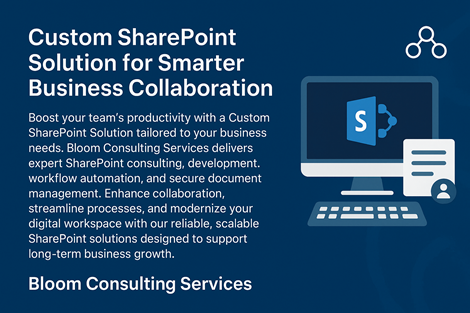 Custom Sharepoint Solution For Smarter Business CollaborationBoost your team’s productivity with a Custom SharePoint Solution tailored to your business needs. Bloom Consulting Services delivers expert SharePoint consulting, development, workflow automation, and secure document management. Enhance collaboration, streamline processes, and modernize your digital workspace with our reliable, scalable SharePoint solutions designed to support long-term business growth.