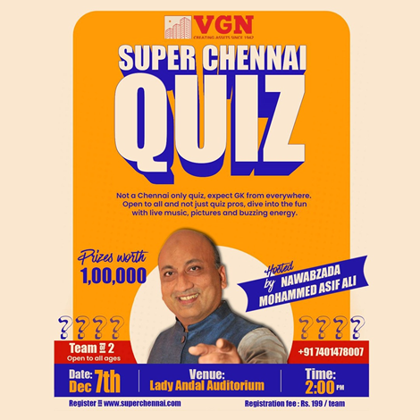 Test Your Smarts - Take The Ultimate Fun Super Chennai QuizThe Super Chennai Quiz is here on Dec 7, 2025! Test your knowledge across sports, music, food, and Chennai. Exciting prizes await—team up and enjoy an epic evening. Hosted at the iconic Sir Mutha Venkatasubba Rao Concert Hall. this quiz promises fresh formats, interactive twists, and fun challenges that will keep the whole room buzzing with energy.