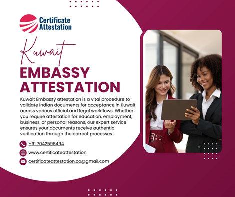 Kuwait Embassy Attestation | Document Attestation ServicesKuwait Embassy attestation is a mandatory legalization step that proves your Indian documents are genuine and acceptable for use in Kuwait, whether you are going for a job, higher education, business setup, or family visa purposes. Without proper attestation, your certificates can be rejected by Kuwaiti authorities, leading to visa delays, job offer cancellations, or rejection of family visa applications. certificateattestation.co@gmail.com Contact No:- +91 7042598494