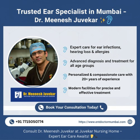 Consult Dr. Meenesh Juvekar, a renowned ear specialist in Mumbai, for expert treatment of ear infections, hearing loss, allergy-related ear problems, tinnitus, and balance disorders. With over 20 years of experience, he provides safe, effective, and compassionate care for patients of all ages. Visit Juvekar Nursing Home for reliable ear care you can trust.