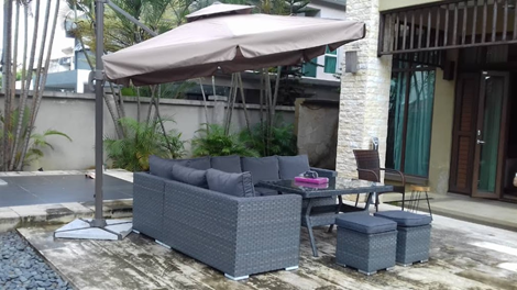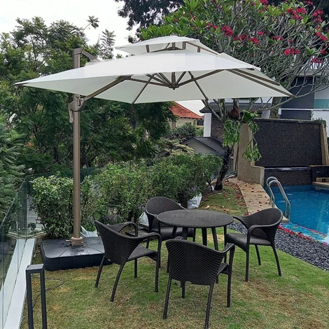 Patio ParasolPatio Parasol Many designs of patio parasols are stocked at decon, those are multi-functional parasols can tit and turn 360 degree, some are with middle pole and wooden frames, and some are with side poles with powder coated aluminum frame, we are parasols with many prices from Ringgit Malaysia three hundred till three thousand ringgit Malaysia.