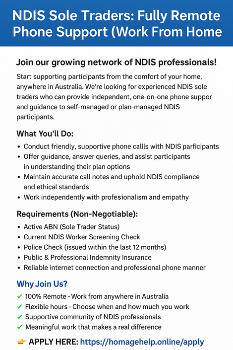Ndis Sole Traders: Fully Remote Phone Support (Work From Home)Start supporting participants from anywhere! We are seeking experienced NDIS sole traders for independent, direct phone support/guidance calls with self-managed/plan-managed NDIS participants. This is a pure support role. Requirements (Non-Negotiable) • Active ABN (Sole Trader Status) • Current NDIS Worker Screening Check • Police Check (within 12 months) • Public & Professional Indemnity Insurance • Reliable internet connection & professional phone manner ?? APPLY HERE: https://homagehelp.online/apply