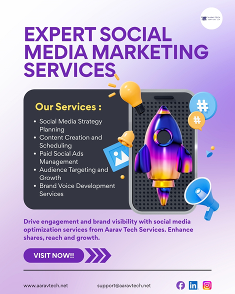 Expert Social Media Marketing Services By Aarav Tech ServicesAarav Tech Services provide professional social media marketing services to transform your brand online. We do strategy to execution so that we create engaging content, reach out and work towards results of your business. Let us help you grow with tailored solutions for social media success.