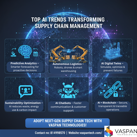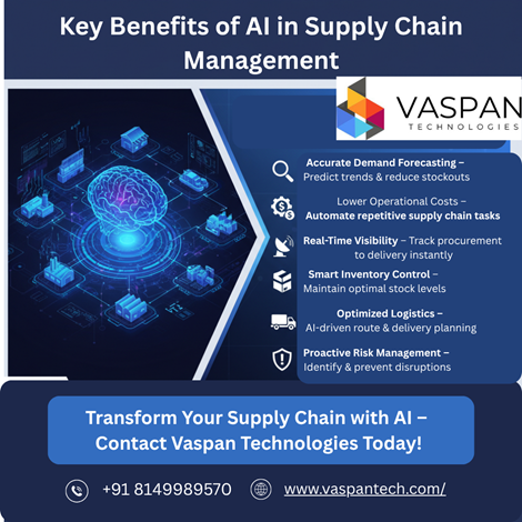 Ai In Supply Chain Management: Key Benefits, Trends & Use CasesWe specialize in AI-powered tools that improve demand forecasting, automate manual processes, enhance real-time visibility, and optimize logistics. From predictive analytics and digital twins to autonomous warehousing, chatbots, and smart risk management—our solutions streamline operations and boost overall efficiency. Whether you want to reduce costs, increase accuracy, or scale your supply chain, Vaspan Technologies delivers reliable and transformative AI-driven innovations tailored to your business needs. Unlock the future of supply chain management with AI. Contact Vaspan Technologies today!