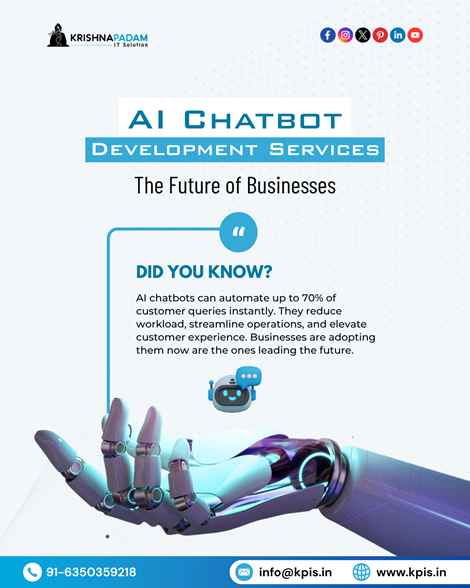 Leading Top Ai Chatbot Development CompanyIf your business could stay awake 24/7, answer every customer instantly, and never forget a single detail- would you take the deal? This is exactly why AI Chatbot Development Services have become one of the most in-demand solutions across industries. As a leading AI Chatbot Development Company, #KrishnaPadamITSolution build intelligent, scalable, and human-like conversational systems. With cutting-edge technologies, expert AI engineers, and a future-ready vision, we deliver AI chatbots that don’t just respond they understand, learn, and transform business operations. We build powerful AI systems using the latest advancements in: Natural Language Processing (NLP) Machine Learning (ML) Large Language Models (LLMs) Deep Learning Generative AI Neural Networks Whether you want to elevate customer experience, automate tasks, or speed up internal operations, we offer industry-leading AI chatbot development services to allow you to drive maximum advantage of chatbot technology. Choosing KPIS Pvt. Ltd. as your AI chatbot development partner unlocks numerous advantages: Build Intelligent AI chatbot models that enhance business efficiency, automate workflows, and significantly improve customer engagement. Hire chatbot developers skilled in AI, ML, and NLP for chatbot development. Adopt a future-ready approach backed by innovation and modern AI technology to ensure your chatbot stays relevant in a rapidly evolving digital landscape. Leverage extensive industry experience in developing AI chatbot application across diverse sectors and specialized niches. Transparent communication & 24/7 Support, ensuring smooth communication and a trusted long-term partnership. If your business is ready to adopt intelligent automation and elevate customer interactions, let’s build something powerful together. Let’s connect and explore how AI chatbots can transform your business.