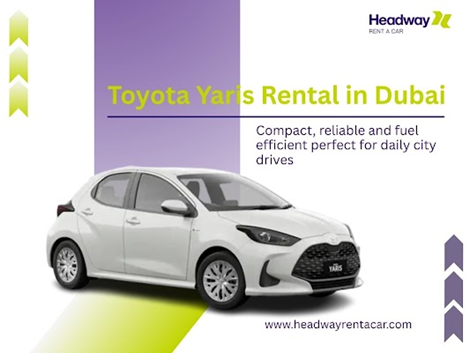Toyota Yaris Rentals Available For Daily And Weekly Use In DubaiExperience stress-free travel in Dubai with a Toyota Yaris from Headway Rent a Car. This versatile car is ideal for personal, business, and city travel, offering a smooth and practical drive. With our straightforward booking process, quick delivery, and helpful service team, your rental experience becomes simple and comfortable. Whether you are touring Dubai or handling daily tasks, a Yaris is a great companion on the road. Book your vehicle now and enjoy flexible plans with Toyota Yaris rent a car Dubai at Headway Rent a Car. https://headwayrentacar.com