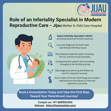 Role Of An Infertility Specialist In Modern Reproductive CareAchieve your dream of parenthood with the Infertility Specialist in Moshi at Jijau Mother & Child Care Hospital. We provide accurate diagnosis, advanced fertility treatments including IVF, IUI, and hormonal therapy, along with compassionate guidance and counseling. With modern reproductive techniques, safe pregnancy planning, and continuous follow-up care, we ensure the best outcomes for couples seeking fertility solutions. #InfertilitySpecialistInMoshi #JijauMotherAndChildCare #IVFTreatment #IUITreatment #FertilityCare #ReproductiveHealth #ParenthoodJourney #FertilitySupport #AdvancedFertilitySolutions #SafePregnancyCare