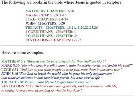 Jesus Quotes In Reference To The Bible.The example showing on the bottom of this display is page 1 of many inside the website listed as the home page. I hope the words of Jesus shown on this display will inspire and educate you. You can see other pages of Jesus quotes by clicking on the home page link given. This is A Free service. Good Luck.