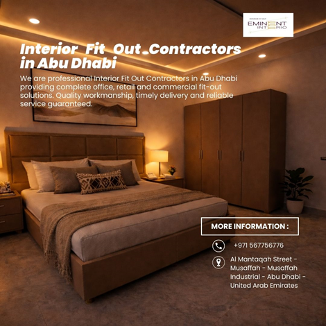 Interior Fit Out Contractors In Abu DhabiWe are professional Interior Fit Out Contractors in Abu Dhabi, delivering complete interior fit-out solutions for offices, retail outlets, commercial spaces, and hospitality projects. Our services include space planning, partitions, ceiling, flooring, MEP coordination, and high-quality finishing works. With a skilled team and efficient project management, we ensure every project is completed on time and within budget. We focus on quality materials, modern designs, and client satisfaction, making us a trusted choice for reliable and durable interior fit-out services in Abu Dhabi.