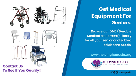 Medical Equipment Support For Seniors: Wheelchairs, Walkers & MoreDurable Medical Equipment for seniors and older adults with permanent disabilities, including wheelchairs, walkers, canes, rollators, commodes, and more. Our program supports adults 65+ or older adults with permanent disabilities who may benefit from mobility or home-safety equipment. The best way to see how we can help is to give us a call so our team can guide you. Our nonprofit operates a DME Library, which allows us to loan or provide equipment to seniors in need. We review your situation through a simple intake process and explore the best available options, including grants, insurance guidance, community resources, and more. Items may include power scooters, manual wheelchairs, walkers, rollators, shower chairs, grab bars, bed rails, orthopedic braces, adult diapers, pads, briefs, and many other donated items ready to be put to good use. Helping Hands Senior Foundation Call: 818-279-6580 Email: info@helpinghandsla.org Website: www.helpinghandsla.org Serving Los Angeles, Orange, Riverside, Ventura, San Bernardino, and San Diego Counties.