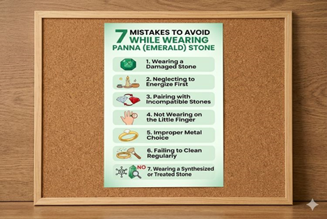 7 Mistakes To Avoid While Wearing Panna StoneWearing a Panna (Emerald) stone can bring powerful benefits, but common mistakes can reduce its effectiveness or even cause negative results. Avoid wearing fake or low-quality emeralds, as they lack astrological power. Choosing the wrong finger, metal, or day can disrupt Mercury’s energy. Skipping purification and energizing rituals is another major mistake. Do not pair Panna with incompatible gemstones without guidance. Exposure to harsh chemicals can damage the stone, reducing its impact. Most importantly, never ignore discomfort or negative signs after wearing it. Following the correct methods ensures you receive maximum benefits and positive energy from this powerful gemstone.
