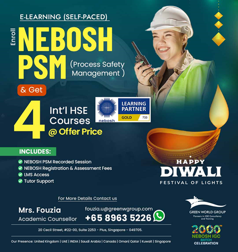 Nebosh Psm E-Learning Course In Singapore—Diwali Offer!Take your safety career to the next level with the NEBOSH PSM E-Learning Course in Singapore, specially designed for professionals working in high-risk industries where effective Process Safety Management is essential. This self-paced program offers unmatched flexibility and value, including NEBOSH PSM recorded sessions, registration and assessment fees, LMS access, and expert tutor support. Enroll now and enjoy an exclusive festive offer—get 4 additional International HSE courses at a special price to boost your expertise in process safety and workplace risk management. As a trusted NEBOSH Gold Learning Partner, Green World Group ensures globally recognized training that empowers you with the skills needed to excel in health and safety management. Celebrate this Diwali Festival of Lights by investing in world-class learning that transforms your future. Contact: Mrs. Fouzia +65 8963 5226 | fouzia.u@greenwgroup.com Visit us: https://greenwgroup.co.uk/singapore/nebosh/nebosh-psm/