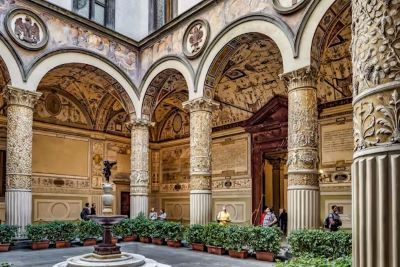 Palazzo Vecchio & Hall Of Five Hundred: Guided TourExplore Florence's City Hall with a two-hour tour of the Palazzo Vecchio Museum. The history of this palace is marked by political intrigue and captivating stories, as well as that of the family that inhabited it for centuries and ruled Florence from 1434 to 1737, the Medici. Visit their private apartments and enjoy the historical atmosphere given by the artworks adorning the walls that will make you travel directly to Renaissance Florence. Admire the impressive frescoes decorating the walls of the Salone dei Cinquecento, which, at 54 meters long, 23 meters wide and 18 meters high, is believed to be the largest room built for the administration of civil power in Italy. Hear the incredible story of how Michelangelo and Leonardo da Vinci were once commissioned to paint two large frescoes for the Hall of Five Hundred, and the astonishing reasons why it didn't work out!