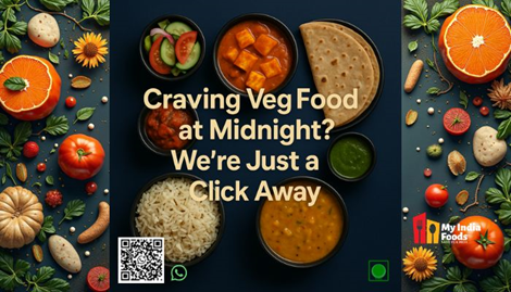 Hungry At Midnight? My India Foods Has You Covered!Craving a delicious, freshly cooked Indian veg meal late at night? Don’t worry — MY INDIA FOODS delivers hot, flavorful, and satisfying vegetarian dishes straight to your doorstep, even after hours! From spicy curries and biryanis to comforting dal, rotis, and snacks, our chefs prepare every order with authentic Indian spices and love. Whether you’re studying late, working overtime, or just craving homely food, we’re your go-to kitchen for midnight hunger. Order conveniently online, track your delivery in real time, and enjoy safe, contact-free service. No more sleeping on an empty stomach — MY INDIA FOODS brings taste, warmth, and comfort to your late-night cravings! Scan QR and Order Now – Hot Meals Delivered Till Late! WhatsApp: 9007111151