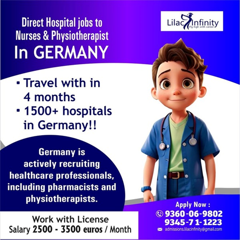 Lilac Infinity-Kollam Offer German Adaptation ProgramGERMANY HEALTHCARE PLACEMENT German Adaptation Program In recent years, Germany has emerged as a leading destination for international migrants.International nurses can now enter the EU healthcare through Germany's Nursing Adaptation Program isn’t just known for its world-class healthcare system—it’s also a land rich in culture, history, and diversity, making it an ideal destination for internationally qualified nurses starting a new chapter abroad.From lively cultural events and regional dishes to artistic treasures,deep appreciation for art --The Black Forest is one of Germany’s most iconic natural wonders, known for its scenic beauty and timeless charm.A key requirement for enrollment in this program is German language proficiency at the B1 level .This ensures that registered nurses can communicate effectively with patients, colleagues, and doctors supporting safe patient care and successful integration into the German healthcare system.Our specialized course equips qualified nurses, pharmacists, and physiotherapists transition smoothly into german hospital placement.Through Lilac Overseas expertly curated German placement programs, provides real-time medical practice and modern equipment-based clinical practice.Germany stands out in Europe for offering highly competitive salaries to nursing professionals.Affordable education is possible in Germany because of the many scholarship opportunities.The smooth visa process and Temporary Residence Permit (TRP) available within months make it easier to fly abroad and begin your migration journey.Eventually, healthcare professionals in Germany can secure permanent residency, allowing them to reunite with their family. This ensures long-term career stability, personal security, and the opportunity to build a fulfilling life within Germany’s strong healthcare system.Unlike many other countries, Germany offers a balanced blend of professional opportunity and cultural richness. Its healthcare adaptation program is not only well-recognized but also supported by strong infrastructure, better pay, and a clear path to residency. Contact us: 9360069802 dm.shamilainfinity@gmail.com https://www.lilacinfinity.com/ "Visit our website: https://www.lilacinfinity.com/ Instagram: https://www.instagram.com/lilac_infinity24/ Youtube: https://www.youtube.com/@LilacInfinity-j5c Linked In: https://www.linkedin.com/in/shamila-infinity-5a417935a/ Twitter: https://x.com/InfinitySh99983 contact us : 9360069802"