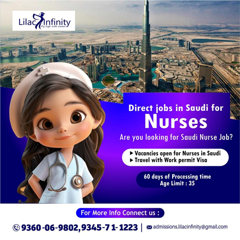 Lilac Infinity Offers Nursing Oppurtunities In Saudi ArabiaLILAC INFINITY OFFERS NURSING OPPURTUNITIES IN SAUDI ARABIA Step into a world where the sun paints the skies and ancient walls whisper stories of centuries past—Saudi Arabia. This ambitious initiative not only highlights iconic destinations like AlUla and Riyadh but also creates a strong demand for skilled professionals, especially in the healthcare sector. With its modern infrastructure, Saudi Arabia is quickly becoming a top choice for nursing professionals seeking a meaningful pathway. Lilac Infinity nursing opportunities in Saudi Arabia, candidates can access advanced clinical training, competitive benefits, and the chance to work within one of the fastest-growing healthcare sectors in the world. Apart from other destinations is its Vision 2030 initiative is transforming the nation’s healthcare sector into one of the most advanced in the region. Saudi Arabia is actively investing in modern hospitals, digital healthcare systems, and international collaborations, for nurses seeking both career growth and a better lifestyle. At Lilac Infinity, our young expert counsellors provide guidance every step of the way—Begin by securing a work permit, ensures a smooth entry into Saudi Arabia’s inclusive healthcare placement through this Nursing Adaptation Program in Saudi Arabia. International nurses exploring nursing opportunities in Saudi Arabia have the chance to work in modern hospital infrastructure, gain practical clinical experience, and make it a preferred global destination. Lilac Infinity a trained leading Overseas Education Admission office, is the ideal partner for aspiring healthcare professionals. If you’re ready to grow your career in a country that values your skills and supports your journey, nursing jobs in Saudi Arabia could be your perfect next step. Contact us: 9360069802 dm.shamilainfinity@gmail.com https://www.lilacinfinity.com/ Contact Information Address: Kochaman Nada, Near Meenakshi Amman Temple, Kollam, Kerala 691005 Pattathanam, Kollam, Kerala 691021 Phone: 9360069802 Email: dm.shamilainfinity@gmail.com Website: www.lilacinfinity.com Social Media ?YouTube: https://www.youtube.com/@LilacInfinity-j5c ?Facebook: https://www.facebook.com/profile.php?id=. ?Instagram: https://www.instagram.com/lilac_infinity24/ ?LinkedIn: https://www.linkedin.com/in/shamila-infinity-5a417935a/ ?Twitter: https://x.com/InfinitySh99983 Hashtags #LilacInfinityofferingNursingplacementProgramSlovenia #Malta #Croatia #NursingAdaptationProgramMalta #NursingAdaptationProgramCroatia #LilacInfinityprovidesNursingRecruitmenttohospitalsinGermany #GermanAdaptationProgrambyLilacInfinity #LilacInfinityoffersHealthcareplacementsprograms #Pharmacist #Physiotherapists #UGPGProgramsinUS/UK/Europe #LilacInfinityofferingStudyAbroadprogramsinUS/UK #RussianMedicine #SingaporeIndustrialTrainingandplacements #ReferandearnprogramofferbyLilacInfinity #DomesticAdmissions #StudyMbbsinRussia