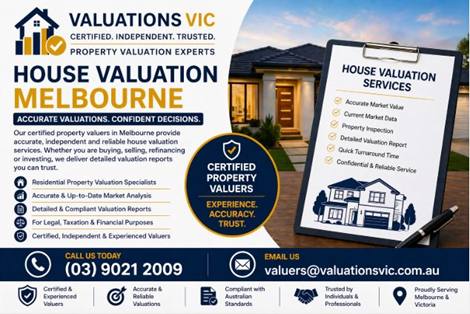 House Valuation Melbourne | Certified Property Valuers VictoriaNeed an accurate house valuation in Melbourne? Our certified property valuers provide independent and reliable valuation services for residential properties across Victoria. Whether you’re buying, selling, refinancing, or investing, we deliver detailed and compliant valuation reports based on current market trends. Our expertise ensures precise property assessments for legal, taxation, and financial purposes.