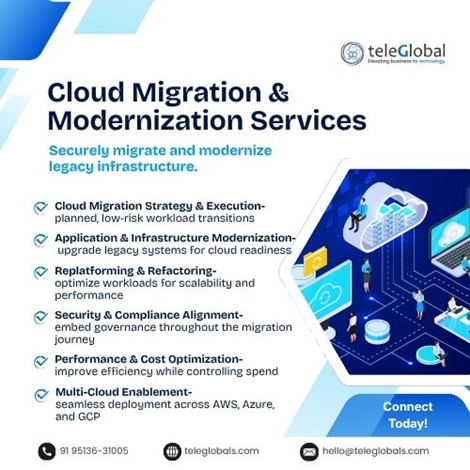 Cloud Migration & Modernization Services In IndiaBuild Resilient, Scalable, and Future-Ready Cloud Environments Teleglobal helps businesses move from legacy systems to modern, high-performing cloud environments. Our cloud migration and modernization services in India are designed to ensure secure, seamless transitions with minimal disruption. We work across leading cloud platforms—including AWS, Microsoft Azure, and Google Cloud—to deliver tailored solutions that improve performance, scalability, and cost efficiency. From defining the right Cloud migration strategy to executing AWS migration and modernization or Azure cloud modernization, we handle the entire journey. Our approach combines proven cloud modernization best practices with strong cloud security architecture, helping you overcome common cloud migration challenges while building a resilient IT foundation. Whether you’re starting fresh or optimizing existing workloads, Teleglobal enables faster innovation, better reliability, and long-term growth through effective cloud migration and modernization solutions. Serving businesses across India, the UAE, Europe, and the US!
